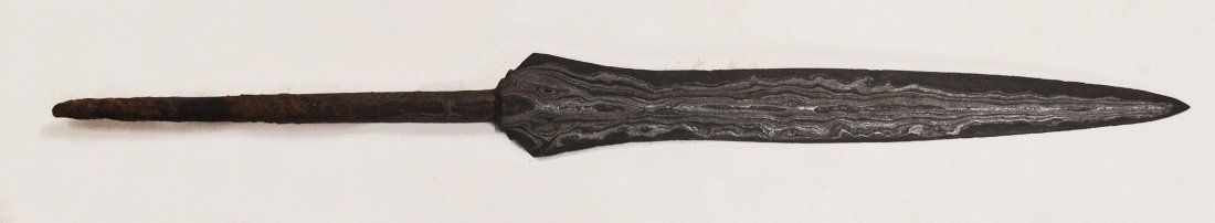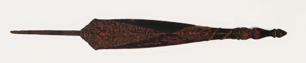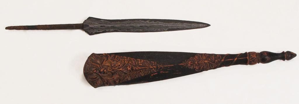 Of characteristic form, expanded at the forte and midsection, and forged of dramatically-patterned pamor, with a lengthy spike tang. The hardwood scabbard finely carved with raised panels of scrolling vinework and turned terminal. First half of the 19th century.Overall length 59 cm. Condition I