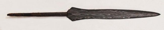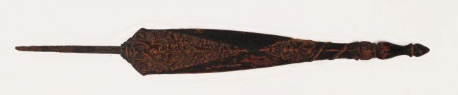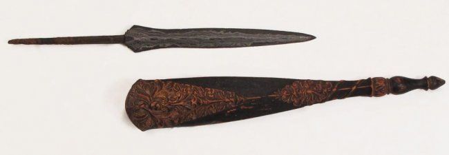 Of characteristic form, expanded at the forte and midsection, and forged of dramatically-patterned pamor, with a lengthy spike tang. The hardwood scabbard finely carved with raised panels of scrolling vinework and turned terminal. First half of the 19th century.Overall length 59 cm.