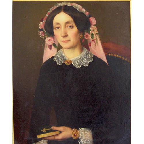 The painting shows a woman with austere aspect characterized by a look and an enigmatic smile what strikes for several aspects: the dress black and sober, is lit up by a collar thinly embroidered and decorated with white laces. Everything show that he is a woman belonging to a high social class: the refinement of the embroideries of the small collar and the cuffs, the jewels in parure and the refinement of the figure, characterized by shoulder well outlined and thin hands with tapered fingers. The unusual headgear is an elegant pink mixture of ribbons and delicate shade flowers, represents his only habit. Index of the left hand brings a faith to the finger, probably symbol of widowhood and between the hands a decorated Bible which lets us suppose her membership to a rich and religious family. The face intensity, however represent the fulcrum of the painting not only symbolically, but also under the point of view of the technique; the author has been able to become with a masterly technique the grace and kindness of a face not more very young woman, but anchors pleasant, the kind features and the very intense eyes which stare at the user from any point he looks at it. The smile, which just wrinkles the lips, of a delicate one been consumed, seem the presence of this painting is able to create a magic complicity relationship with who looks what makes pleasant and nice in every type of environment.