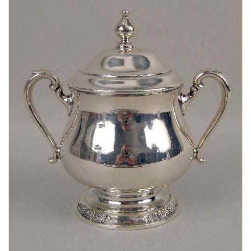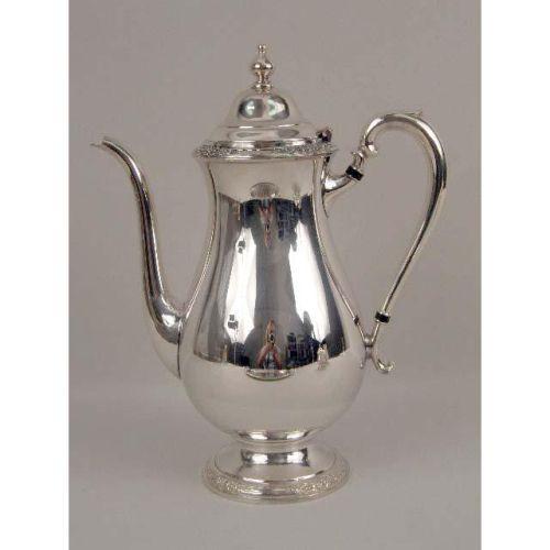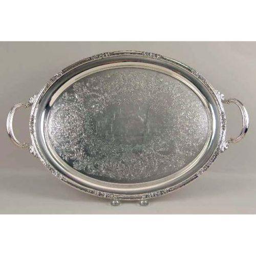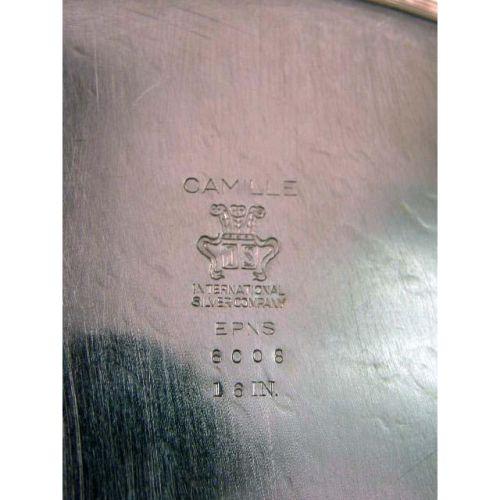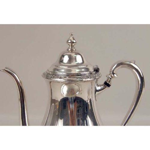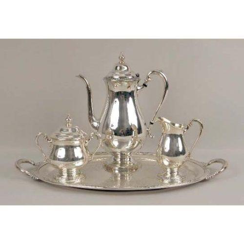 AN INTERNATIONAL SILVER "CAMILLE" PATTERN SILVER PLATED THREE PIECE COFFEE SERVICE ON MATCHING DOUBLE HANDLED OVAL TRAY<BR><BR>comprising a coffee pot, 11-1/2"high, sugar bowl and cream jug, tray 19-1/4"long