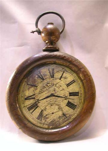 AN IRON AND PAINTED PINE POCKET WATCH FORM TRADE SIGN; American, of typical form, the dial inscribed "Hackett" on both sides. 30"H x 20"W (weathered, minor losses)