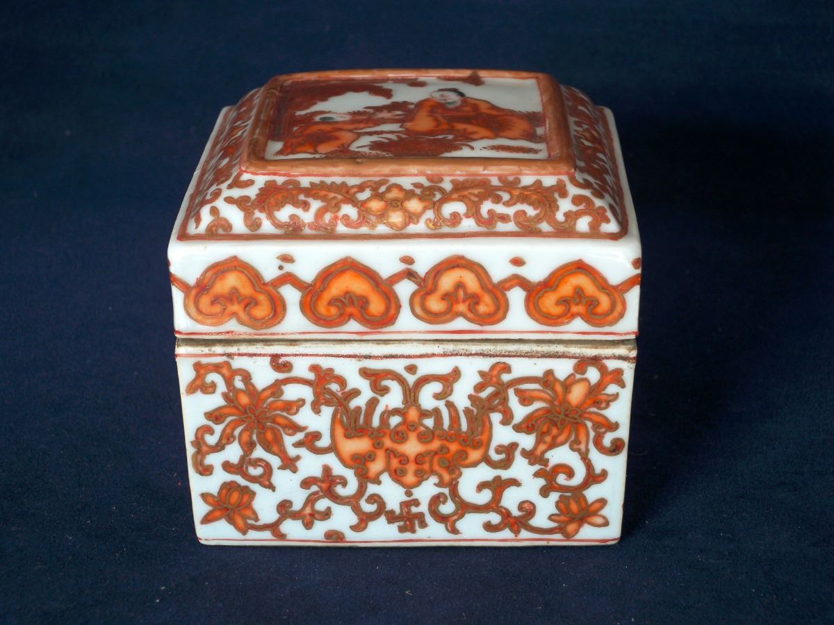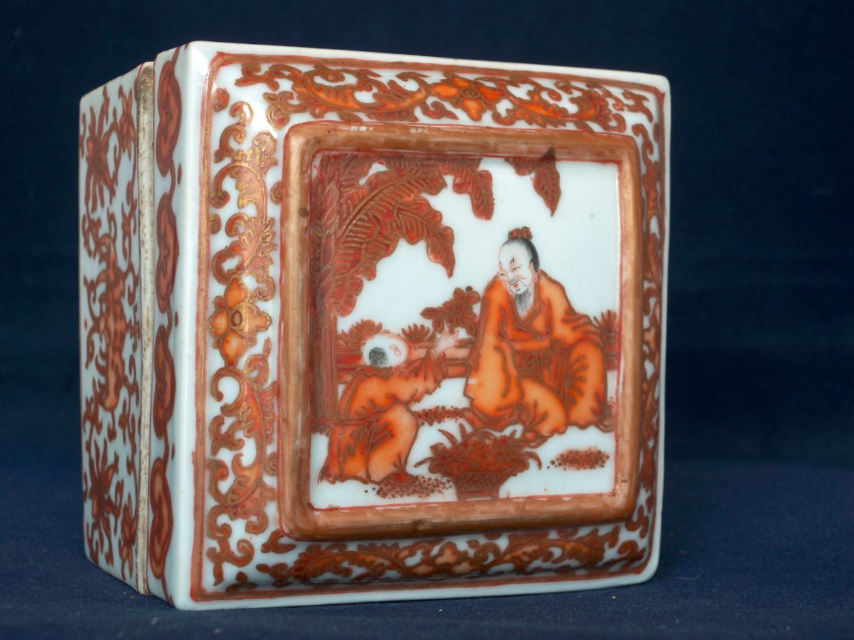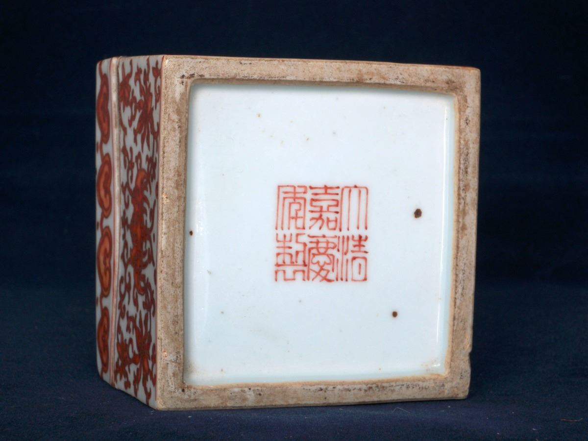 An ink box with iron red auspicious patterns painted, Made in Qing Qianlong Year mark. 3.75"×3.75"×3.75"