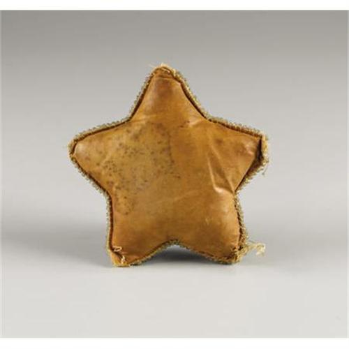 <B>AN IROQUOIS BEADED CLOTH WHIMSEY<BR><BR></B></I>c. 1900 in the shape of a star, decorated with a bird and a pair of American flags, stitched in various shades of opaque and translucent beads<BR><BR>Length: 6 inches <B>Condition Report:</B> Overall poor condition. Beadwork with loss. Fabric with stains and approx. 2 tears the largest approx. 1/2". Stitching along edges with loss. No apparent restoration.<BR><BR><b>Shipping:</b> Requires 3rd Party Shipping (<a target="_blank" href="http://www.heritageauctions.com/common/shipping.php">view shipping information</a>)
