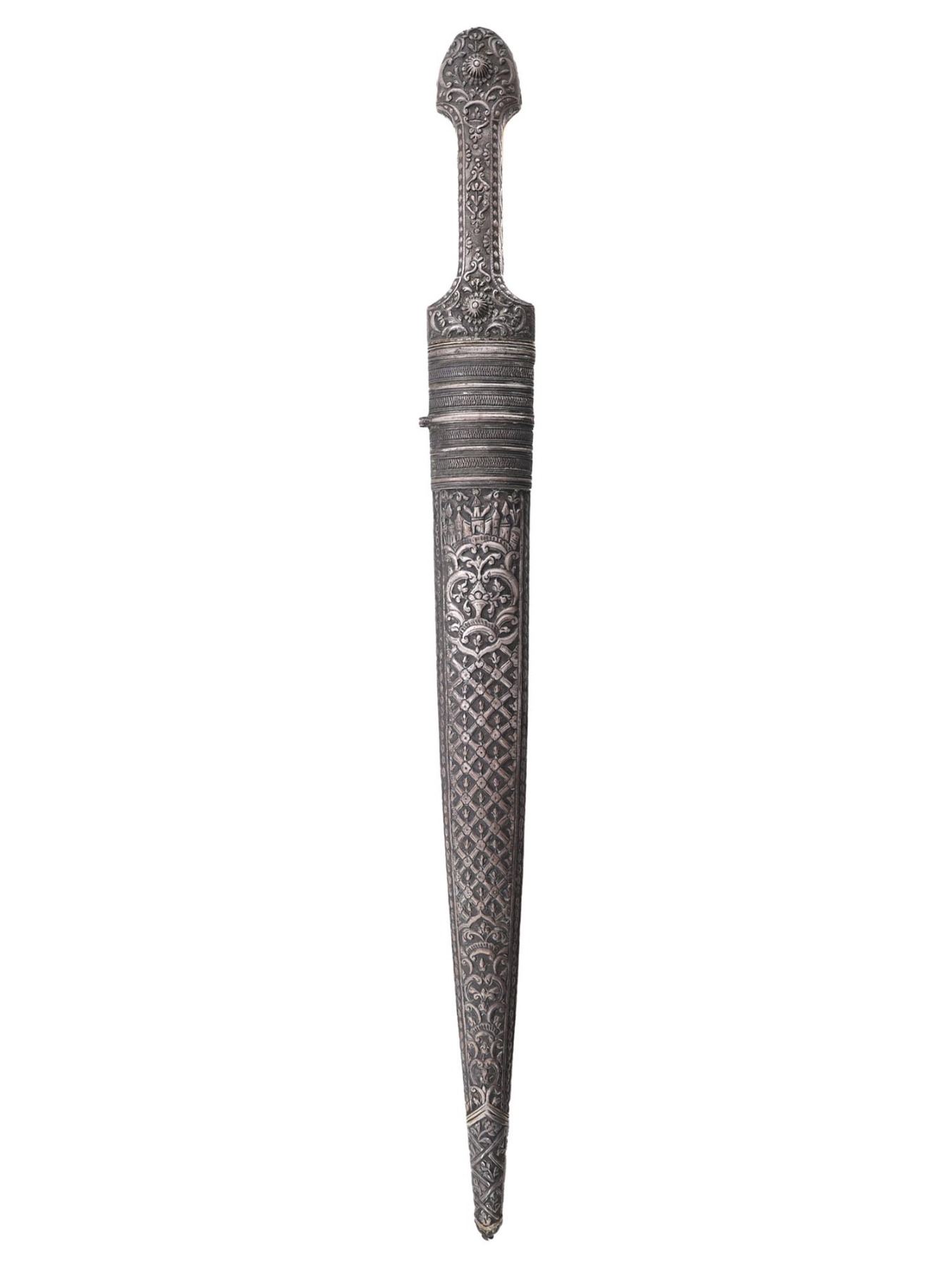 Turkish (Ottoman) style dagger, with a 15 1/2 inch spear point blade with a ridged center line on each side of the blade. The ricasso of the blade has been extensively inlaid with gold Arabesque vine patterns on both sides. The hilt is masterfully relief chiseled with floral patterns throughout featuring a castle on the rear side of the pommel. Similar patterns are relief chiseled on the scabbard, which is also silver plated, including an additional castle.