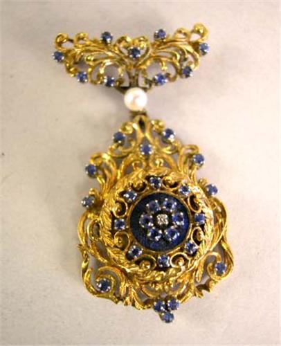 AN ITALIAN 18K YELLOW GOLD DIAMOND SAPPHIRE AND PEARL LAPEL WATCH; Dial reads "Toliro 17 Jewels"
