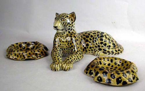 AN ITALIAN POTTERY LEOPARD; Together with two matching bowls Leopard: 14"l x 7"h