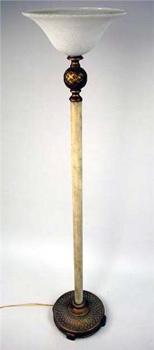 AN IVORY AND FAUX BRONZE-PAINTED METAL STANDING FLOOR LAMP; Surmounted by a frosted glass shade continuing to a reel-and-basket-woven ball finial above an ivory colored standard and ending on a similarly woven circular base, 5'-10"h