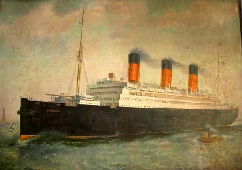 AN OFFSET LITHOGRAPH ON TIN, A. BISHOP; R.M.S. Berengaria in port with tugboat and the Statue of Liberty, signed, lr, 1924, 28"h x 38"w