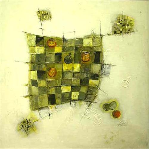 AN OIL AND SAND ON PAPER; depicting a surreal chessboard with whimsical pieces, signed l.r. Hado. 27" x 27 1/2"