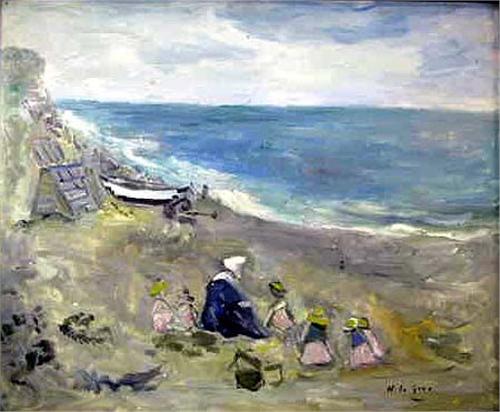 AN OIL ON BOARD OF A BEACH SCENE; Probably French, signed illegibly, lr, 14 1/2"h x 17 1/2"w
