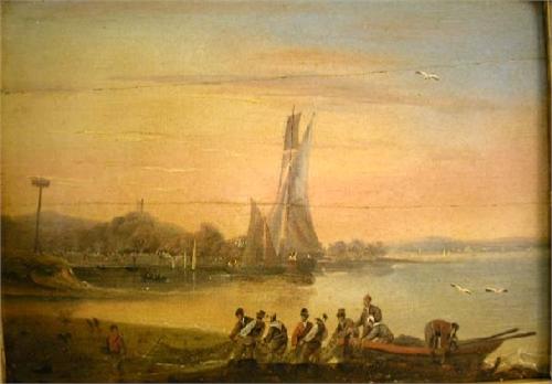 AN OIL ON BOARD OF A SAILBOAT IN HARBOR; 9 1/2"h x 6 1/2"w