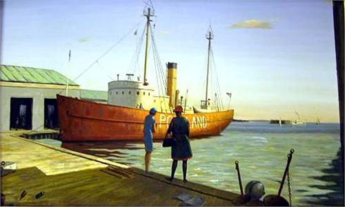 AN OIL ON BOARD OF SAILING SHIP IN PORT; Portland, Signed LL Sophia Studios 35"h x 21"w