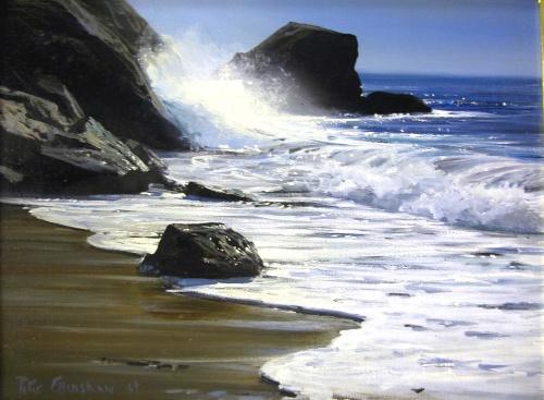 AN OIL ON BOARD; depicting a seascape of waves crashing against rocks, signed l.l. Peter Ellenshaw '64 (American, born 1913), verso with his copyright stamp, a stamp from the Hammer Galleries, New York and a card from the Raydon Gallery, 1019 Madison Aven
