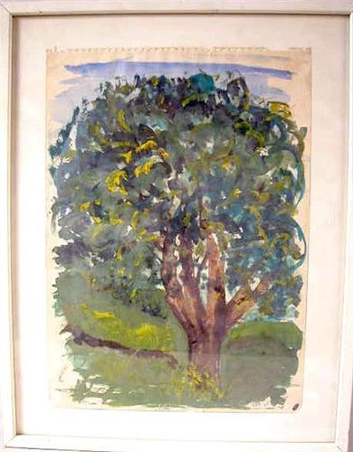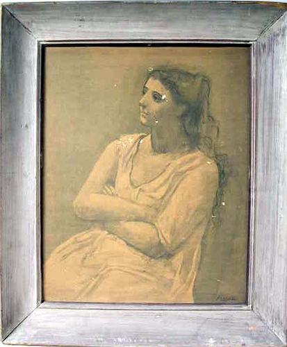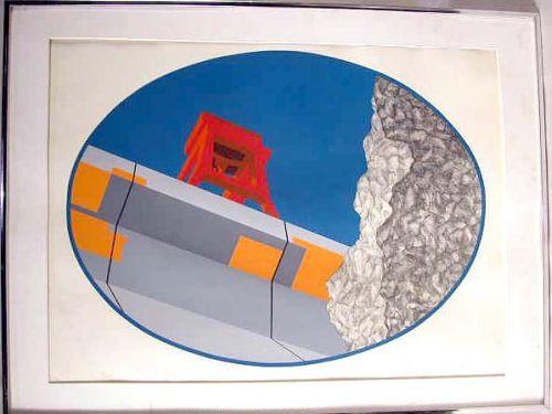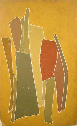 Abstract, unsigned. 30"h x 48"w. Together with a Picasso reproduction "Woman in White", 18 1/2"h x 14 3/4"w, a watercolor on notebook paper, signed SES `55, 13 1/4"h x 10"w, and an Allan D`Arcangelo abstract print, 19"h x 26 1/4"w, missing glass. 4 pieces.