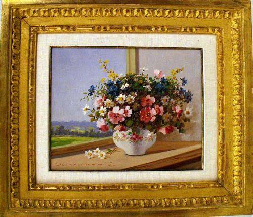 Vuvocic, floral still life, bears signature ll. 7 1/2"h x 9"w.