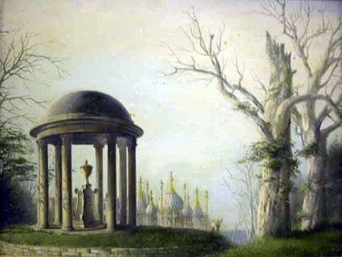 AN OIL ON CANVAS; Temple and Pavilion, Felix Kelly (American, 1916-1997), depicting a Grecian temple fronting a fantastic Moorish edifice, probably the Brighton Pavilion; signed l.r. Felix Kelly. Verso with a number of labels, one from the Columbus Galle