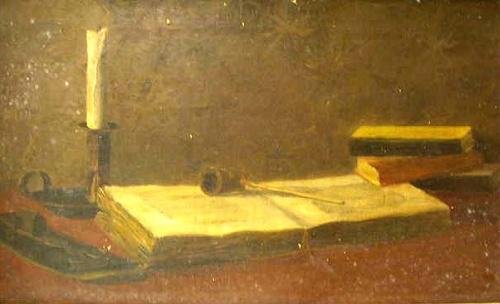 AN OIL ON CANVAS; still-life depicting a pipe, books and candle, unsigned. Losses. 12" x 20"