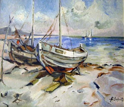 AN OIL ON CANVAS; depicting a pair of beached boats, signed l.r. in old German script, F. Schutz. 16 1/2" x 19 1/2"