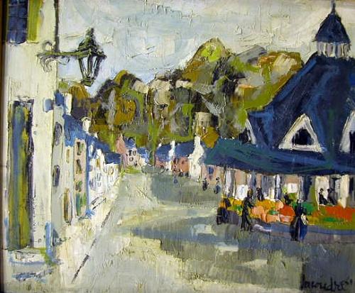 AN OIL ON CANVAS; depicting a European street scene, signed l.r. Lacoudre '69 (probably Claude Lacoudre, French, dates not known). 21" x 25 1/2"