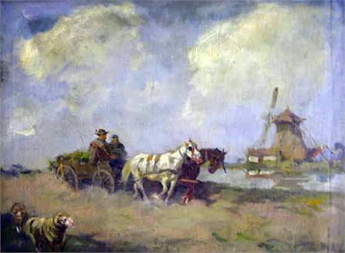 AN OIL ON CANVAS; depicting a Dutch scene of a peasant couple in a wagon passing by a windmill, signed l.r. indistinctly; verso with another indistinct signature, wording and stamp. 23 1/2" x 31"