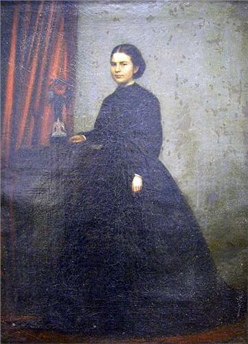AN OIL ON CANVAS; depicting a woman in deep mourning, probably a Civil War-era widow, unsigned, but with a label verso from the Raydon Gallery, 1091 Madison Avenue, New York, noting the artist to be E.(astman) Johnson (American, 1824-1906). Repaired punct
