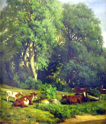 AN OIL ON CANVAS; depicting resting cows on the edge of a forest, signed l.l. M. Waterman (Marcus A Waterman, American, 1834 - 1914). Verso with a label from the Raydon Gallery, 1091 Madison Avenue, New York, and one dated Feb. 9 1924. 25" x 21"