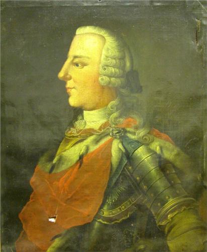 AN OIL ON CANVAS; depicting a European nobleman clad in a suit of armor and ermine-tipped cape. Punctures, losses. 29 1/2" x 23 1/2"