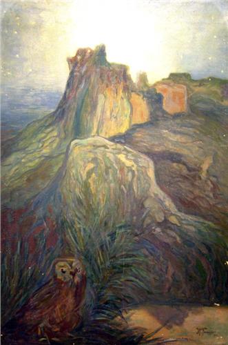 AN OIL ON CANVAS; Les Baux -La Nuit (The Beams - The Night), an eerie depiction of a barren, craggy landscape under a full moon and stars, staring owl in one corner, signed l.r. M. Frances 1900. Very minor losses. 48" x 32"