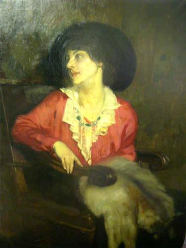 AN OIL ON CANVAS; depicting an elegantly dressed woman holding a white fox stole. Unsigned. Losses. 50" x 39 1/2"