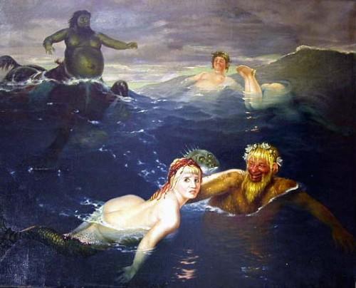 AN OIL ON CANVAS AFTER ARNOLD BOCKLIN; In the play of the waves/ Sea Nymphs and Neptune, whimsical sea study with mythological figures, 30 1/2" x 38"