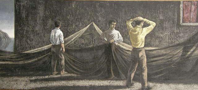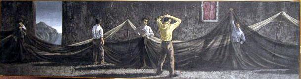 AN OIL ON CANVAS DEPICTING YOUNG MEN IN A FUNEREAL INTERIOR