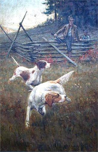 AN OIL ON CANVAS; Depicting a hunter with two pointers, signed LR Frank Sttik, some tears 38 1/2"h x 25 3/4"w