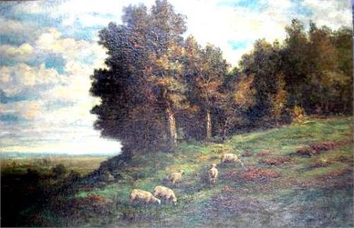 AN OIL ON CANVAS; Depicting sheep in a pasture, bears a partially legible signature LR (?) Becket, re-lined 24"h x 36"w