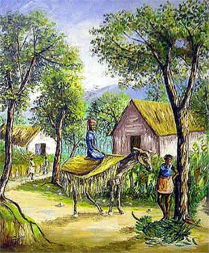 AN OIL ON CANVAS, Haitian native riding astride donkey, another woman standing next to trees, thatched houses and mountains in the distance, signed lower right, David Rouzier, (Haitian, 20th c.), 23" x 19"