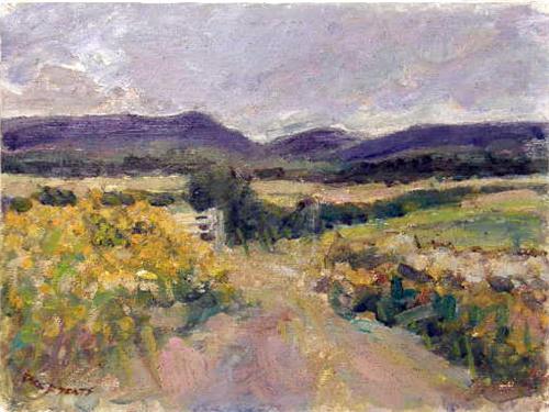 (Jack Butler Yeats, Irish, 1871-1957). Unframed, signed by the artist l.l.c., verso with the remnants of an old exhibition tag giving title and artist information. A painter, writer and graphic artist, Jack was the younger brother of famed poet W. B. Yeats. He spent much of his boyhood in County Sligo and maintained that its landscape and light were what inspired him to become a painter. He sporadically attended various art schools, including the Westminster School of Art, and worked as a black-and-white illustrator, chiefly for magazines. He was over 30 before he began to work regularly in oils; for years his style remained essentially conservative, but in the mid-1920s his forms, as seen in this landscape, were defined by brush strokes rather than by line, his colors grew richer and more luminous and his earlier realism gradually gave way to a highly personal Impressionism. Sight size 12"h x 15 1/2"w Losses to the corners where the piece was once pinned.