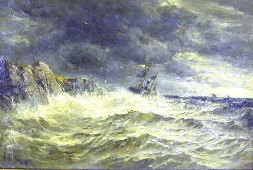 AN OIL ON CANVAS, JAMES GALE TYLER (AMERICAN 1855-1931); Maritime scene with ship, cliffs, and sea birds, signed, ll, J.G. Tyler, 12"h x 18"w