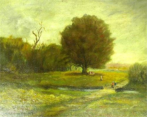 AN OIL ON CANVAS, KENDALL; depicting picnic under tree, signed, ll, dated, apx. 10 1/2"h x 13 1/2"w