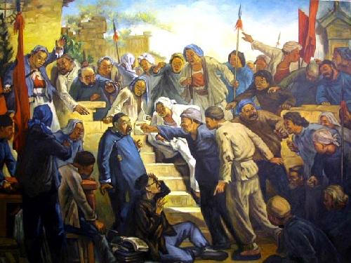 AN OIL ON CANVAS OF A CHINESE SOCIAL SCENE; 4'8"h x 5'11"w