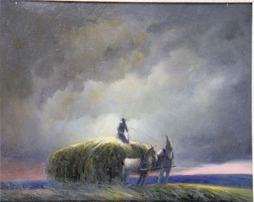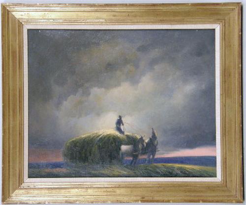 <b>AN OIL ON CANVAS OF A FARMER HAYING AT SUNSET</b>