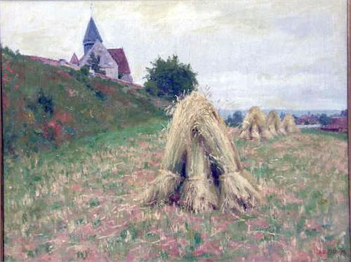 <b>AN OIL ON CANVAS OF A FIELD OF BALED HAY, A MEDIEVAL CHURCH AND TOWN IN THE DISTANCE</b>