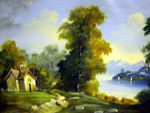AN OIL ON CANVAS OF A GIRL WALKING TO A HOUSE; Signed ll, D. Motley, 28"h x 21"w, losses
