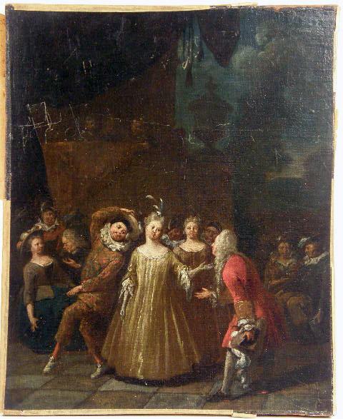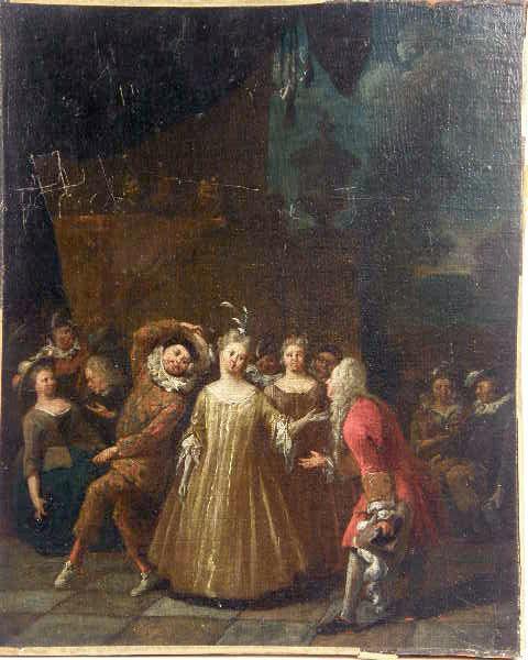 Unsigned, depicting fashionably-dressed men and women capering to the strains of the band depicted in the balcony above. Sight size 16"h x 13"w Mounted on board, the board then backed with new canvas. Sides trimmed, old stretchers cut down. Scratches to painted surface, sides covered with old masking tape.
