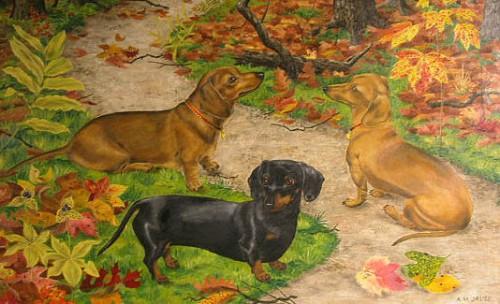 AN OIL ON CANVAS OF THREE DACHSHUNDS IN THE FALL; Signed LR A.M. Jauss 16"h x 26"w