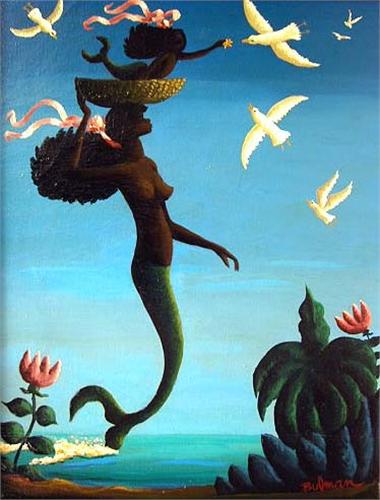 AN OIL ON CANVAS, ORVILLE BULMAN; Whimsical scene with mermaid and seagulls, signed ll Bulman, Orville Bulman 1903-1978, 17" x 13"