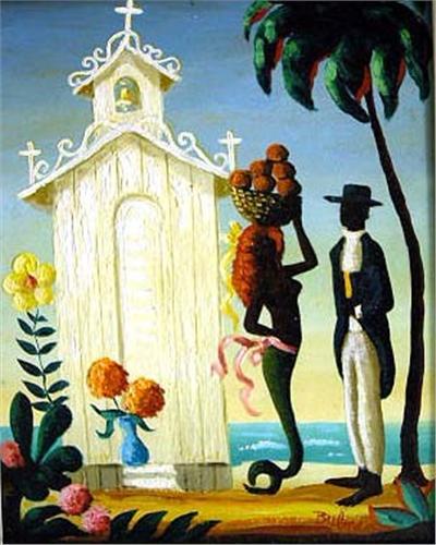 AN OIL ON CANVAS, ORVILLE BULMAN; La Causette, Whimsical scene with mermaid and gentleman outside of church, signed lr Bulman, Orville Bulman 1903-1978, 9 1/2" x 7 1/2"