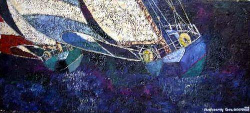 AN OIL ON CANVAS, SAILING SHIPS SIGNED LR ANTHONY GOLDSCHMIDT;