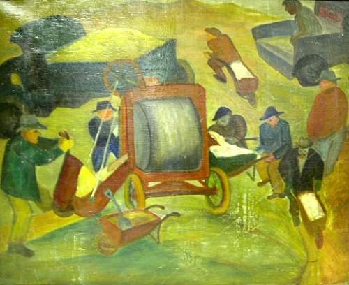 AN OIL ON CANVAS, SID GOTCLIFFE; primitive depiction of workers, signed lr, on verso, WPA WORKERS, EAST RIVER, SID GOTCLIFFE,