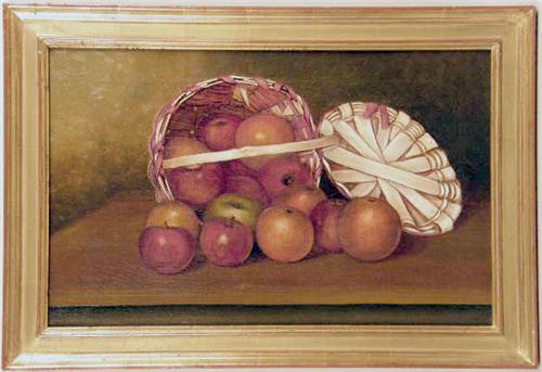 <b>AN OIL ON CANVAS STILL-LIFE OF APPLES SPILLING FROM A WOVEN BASKET</b>