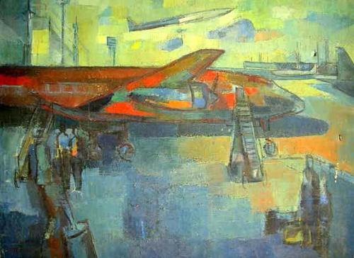 AN OIL ON CANVAS; Depart Pour le Ciel, depicting a plane at an airport boarding for takeoff, unsigned. Together with a colorful abstract lobster, signed l.r. T. Charollera (?), signed verso Le Homard. 2 pieces. Slight losses. The first 25 1/2" x 31 1/2"