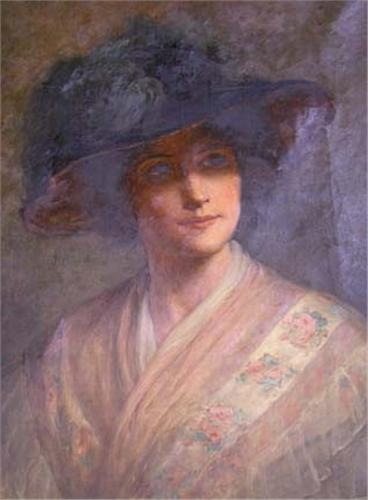 AN OIL ON CANVAS; Portrait of young woman wearing a large brimmed hat, some inpainting, 23" x 17", losses